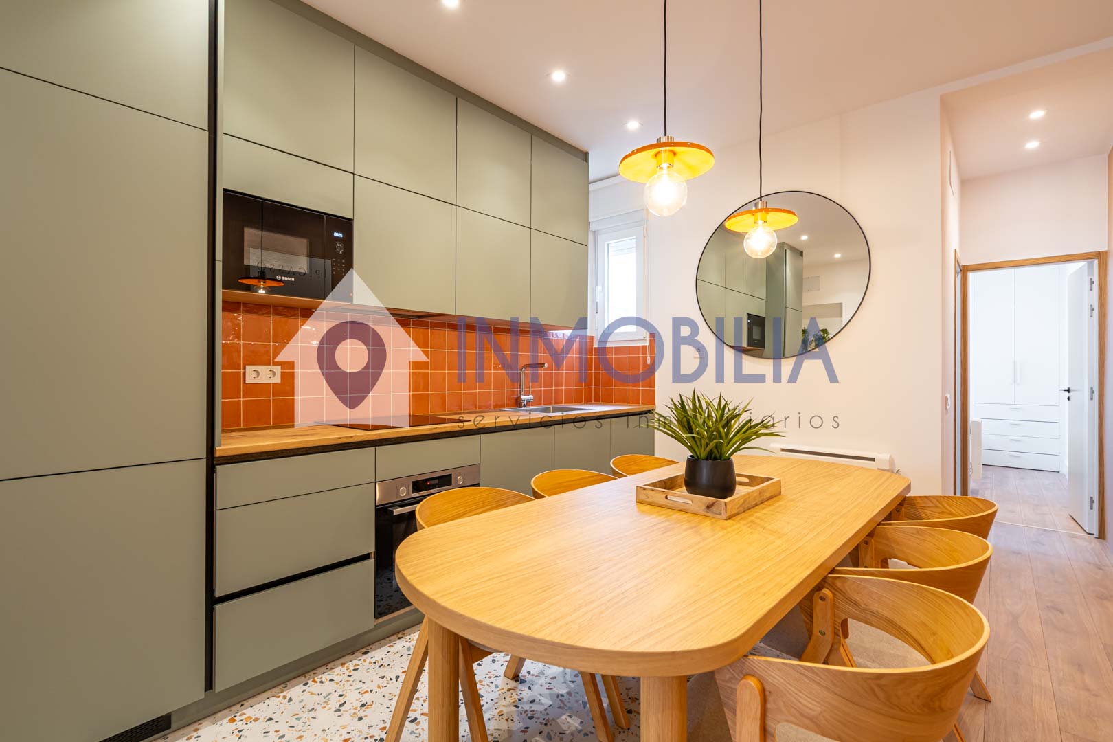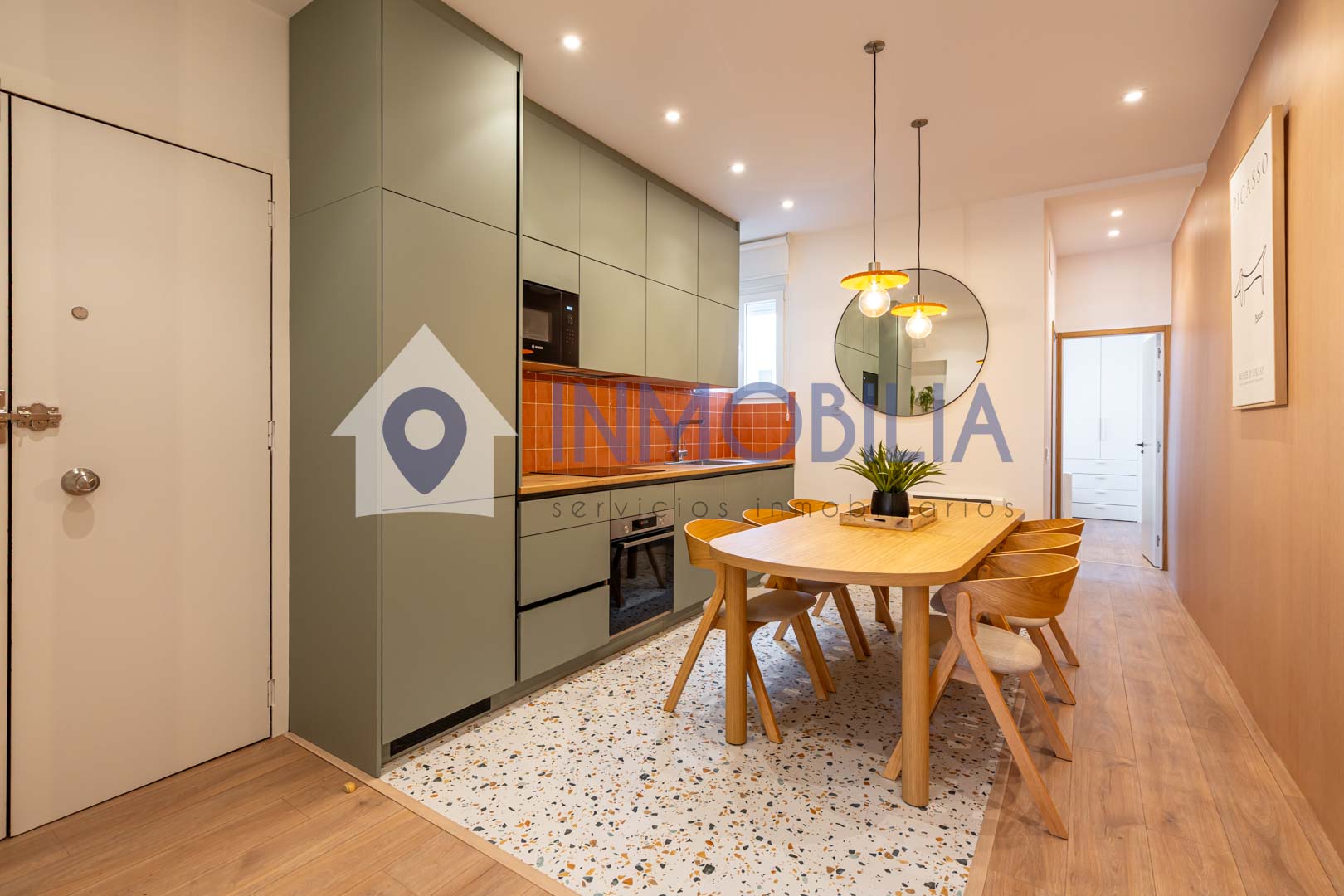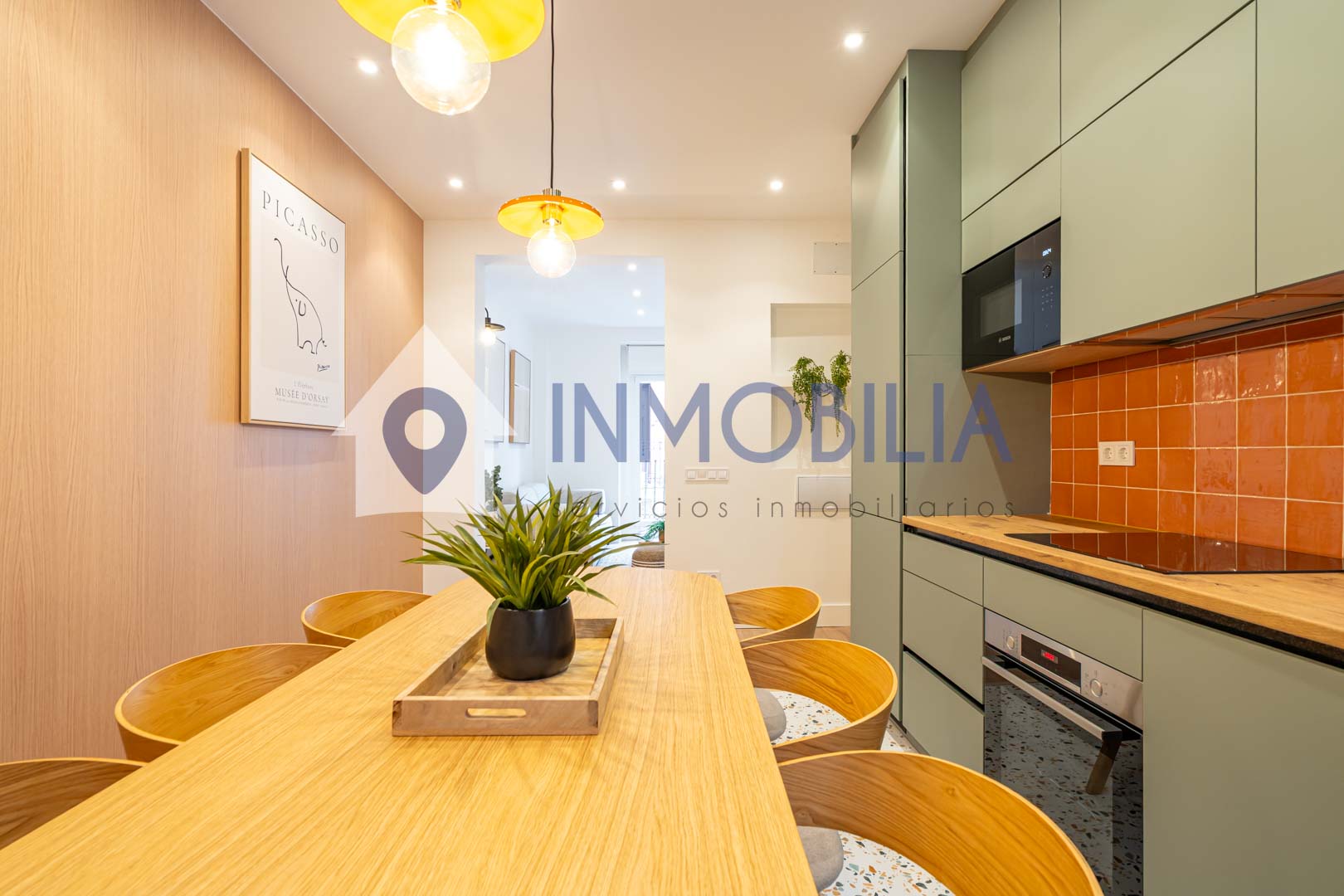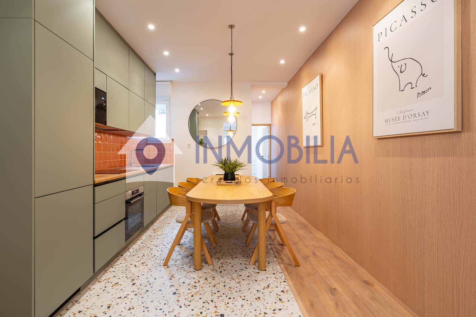 Desde que cruzas la puerta, la sensación es clara: aquí se ha cuidado cada detalle. El salón-comedor, amplio y luminoso, te recibe con una cocina abierta hecha a medida, con muebles en un verde sofisticado que se integra a la perfección con los panelados de madera natural. Un diseño pensado al milímetro para quien valora los espacios únicos. Y sí, es exterior: la luz entra a raudales por sus balcones, reforzando esa atmósfera elegante y acogedora que sólo las casas bien pensadas transmiten.