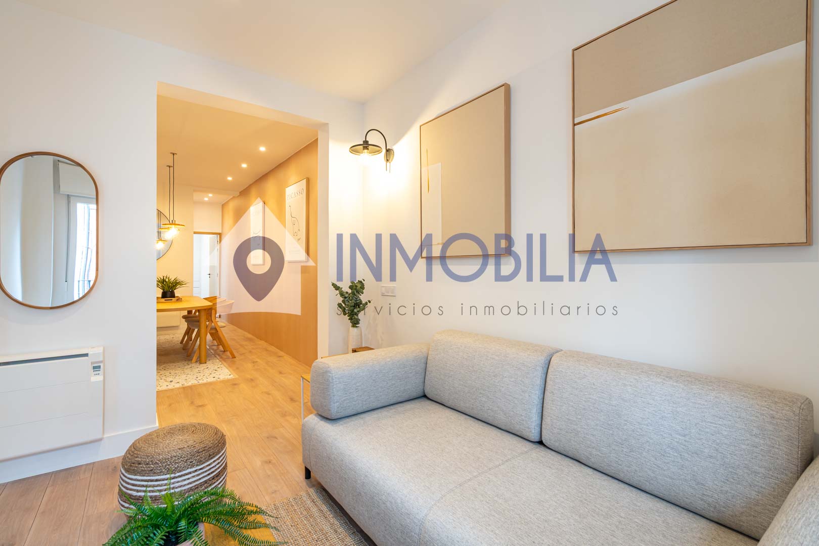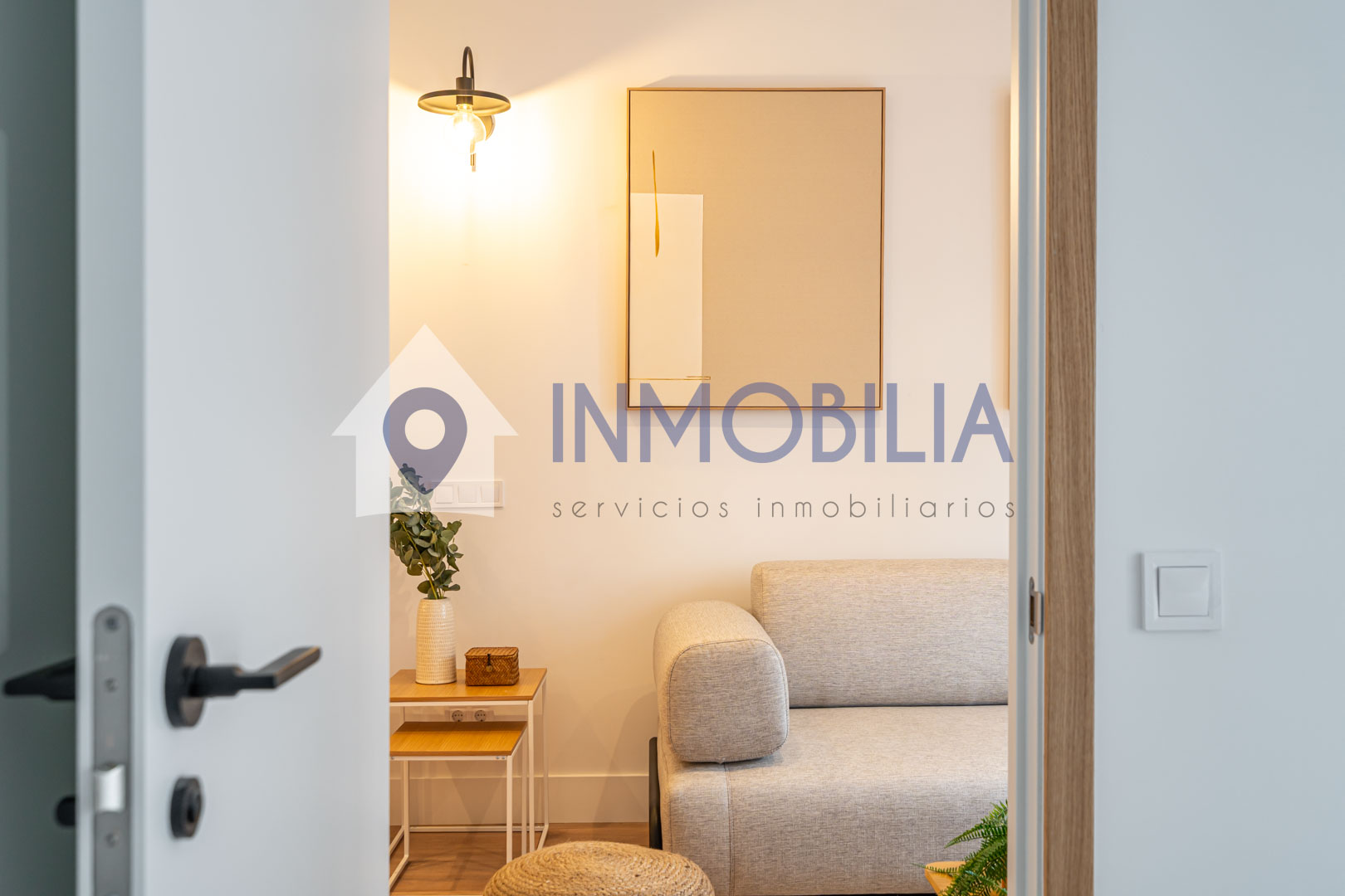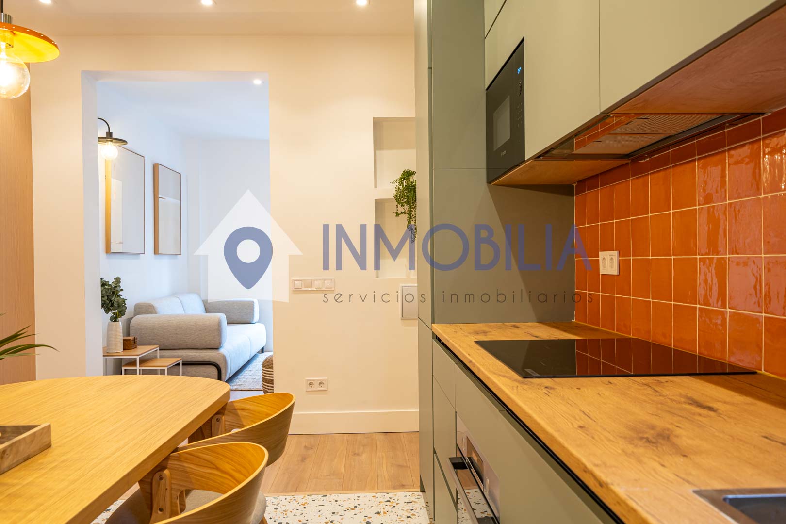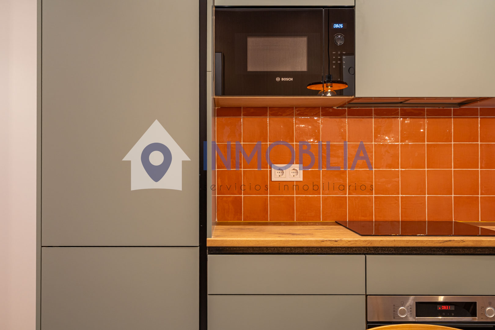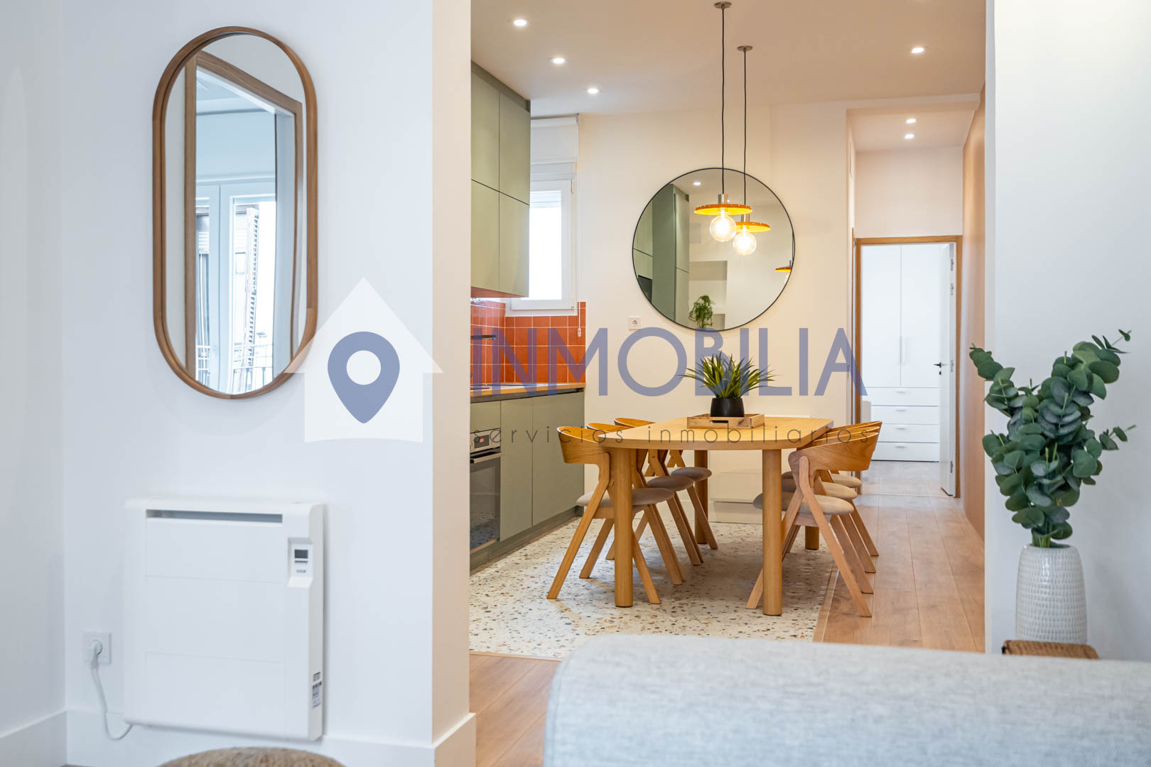 Desde que cruzas la puerta, la sensación es clara: aquí se ha cuidado cada detalle. El salón-comedor, amplio y luminoso, te recibe con una cocina abierta hecha a medida, con muebles en un verde sofisticado que se integra a la perfección con los panelados de madera natural. Un diseño pensado al milímetro para quien valora los espacios únicos. Y sí, es exterior: la luz entra a raudales por sus balcones, reforzando esa atmósfera elegante y acogedora que sólo las casas bien pensadas transmiten.