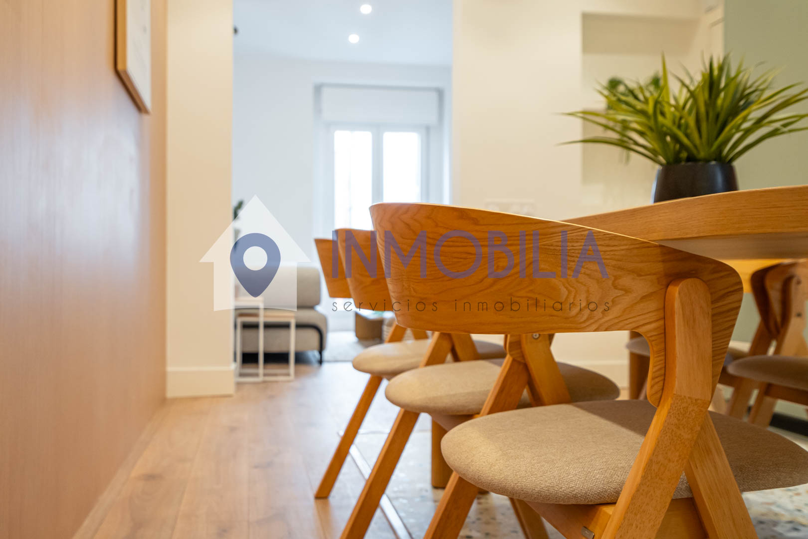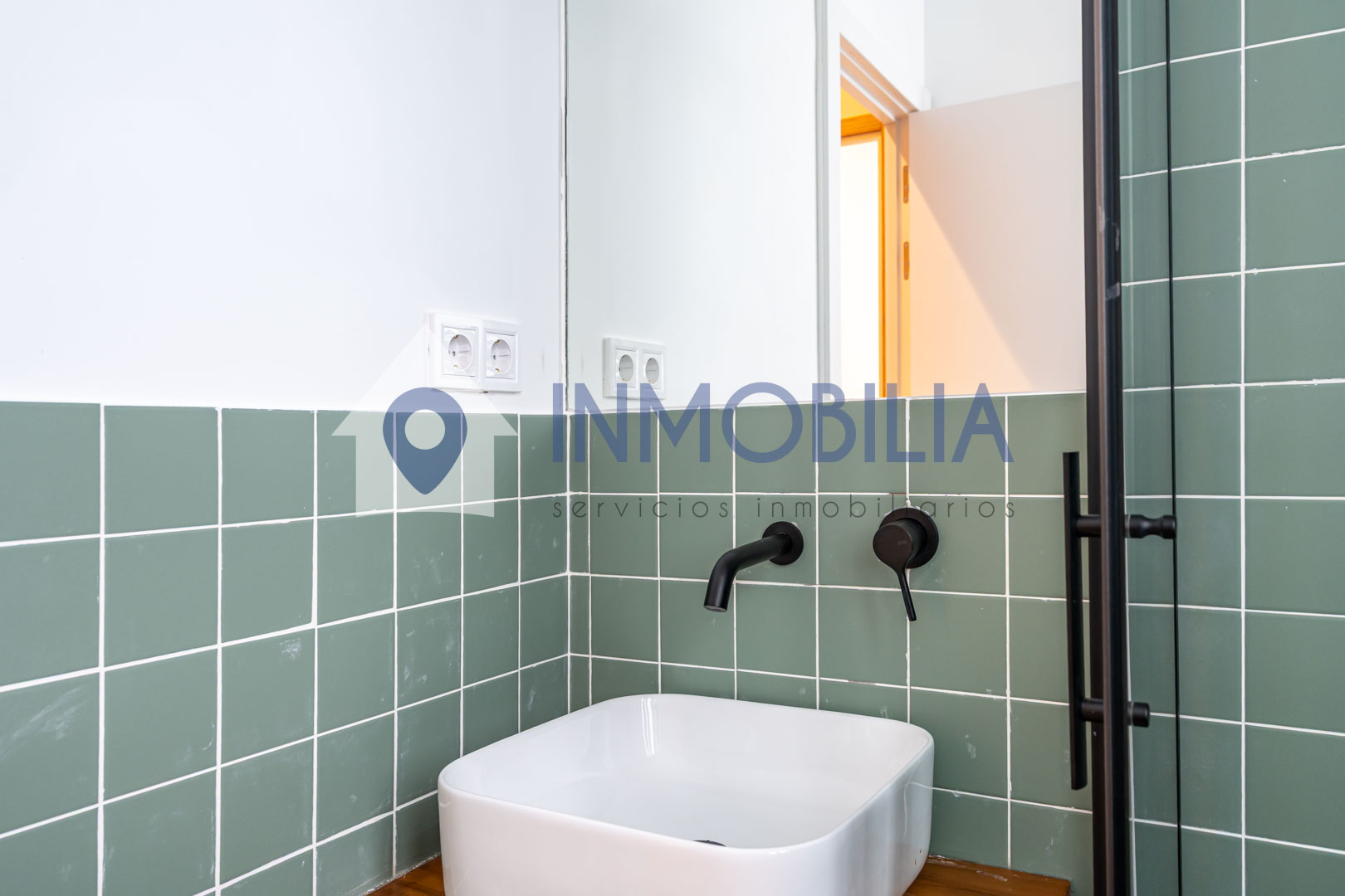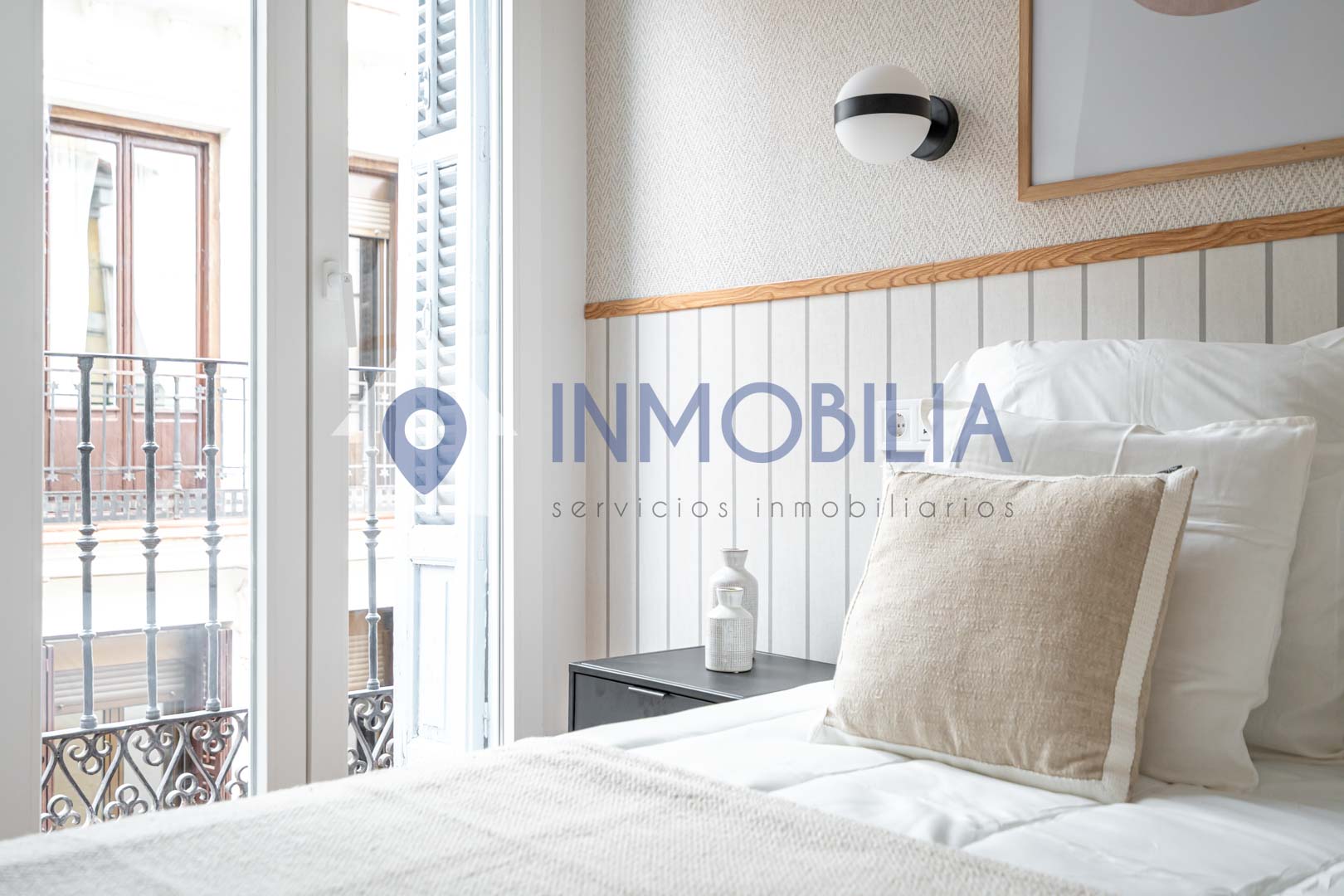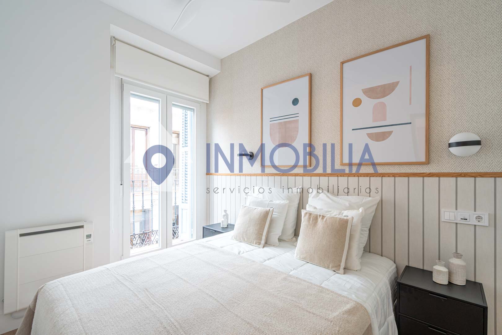 El dormitorio principal también es exterior, con armario empotrado y balcón, manteniendo esa conexión visual con el Madrid más castizo, pero con todo el confort de hoy: suelos de terrazo de alta gama, ventanas con rotura de puente térmico y una climatización cuidada para vivir bien durante todo el año.