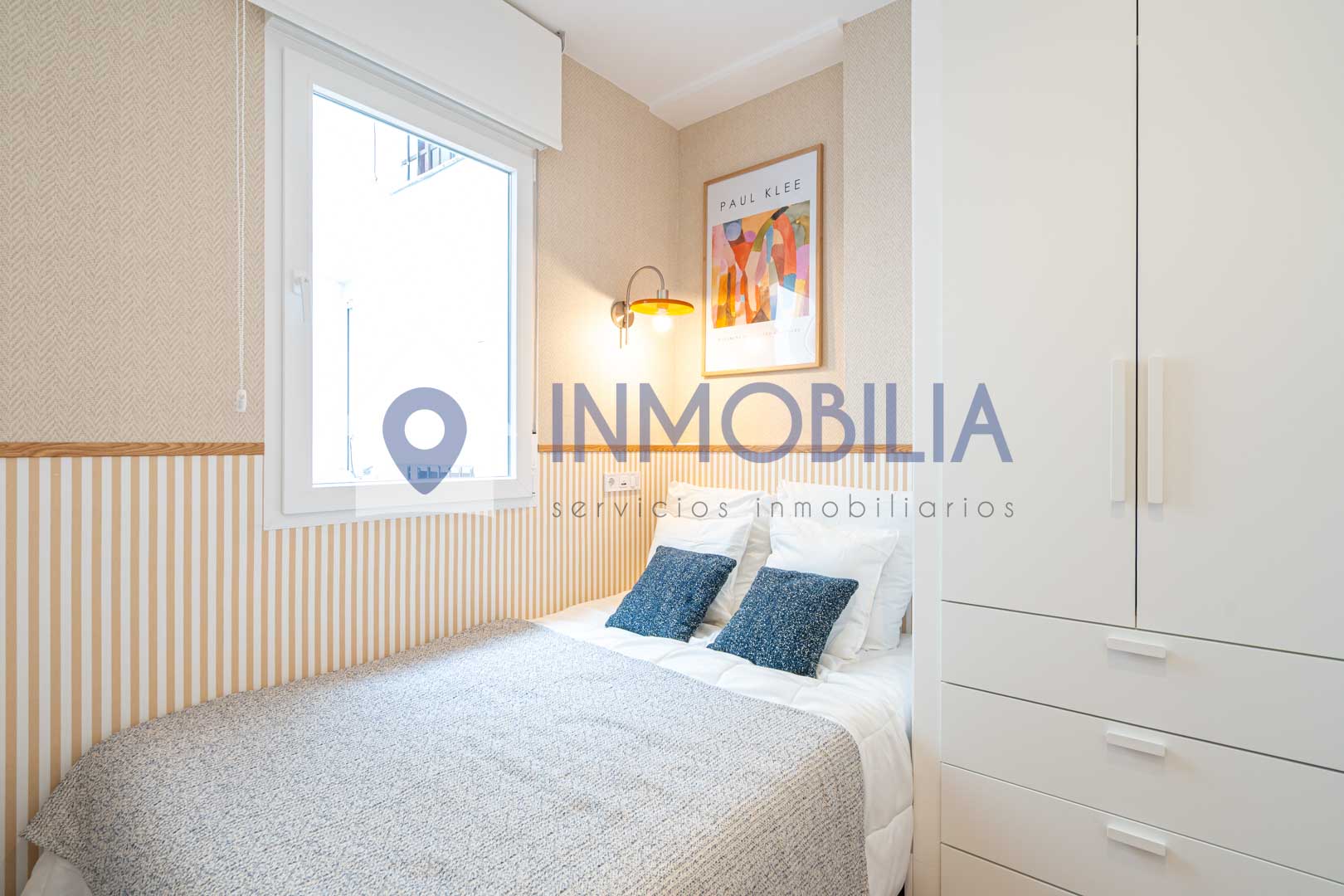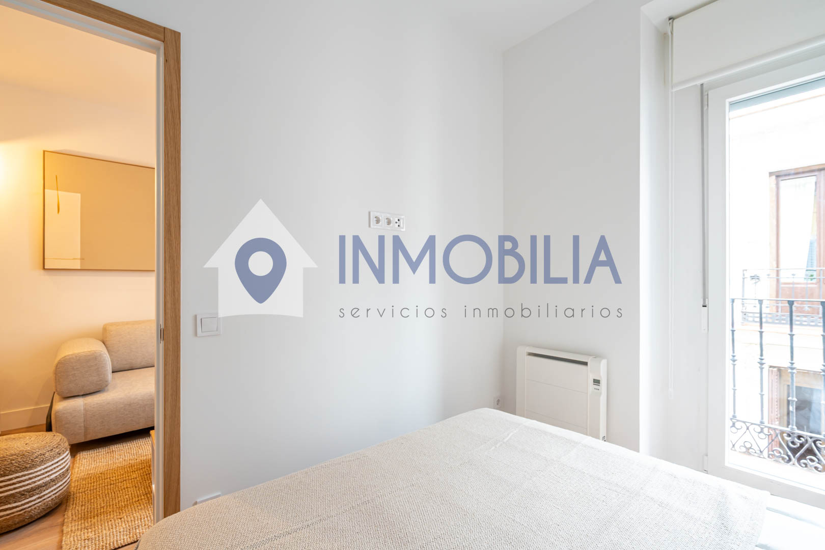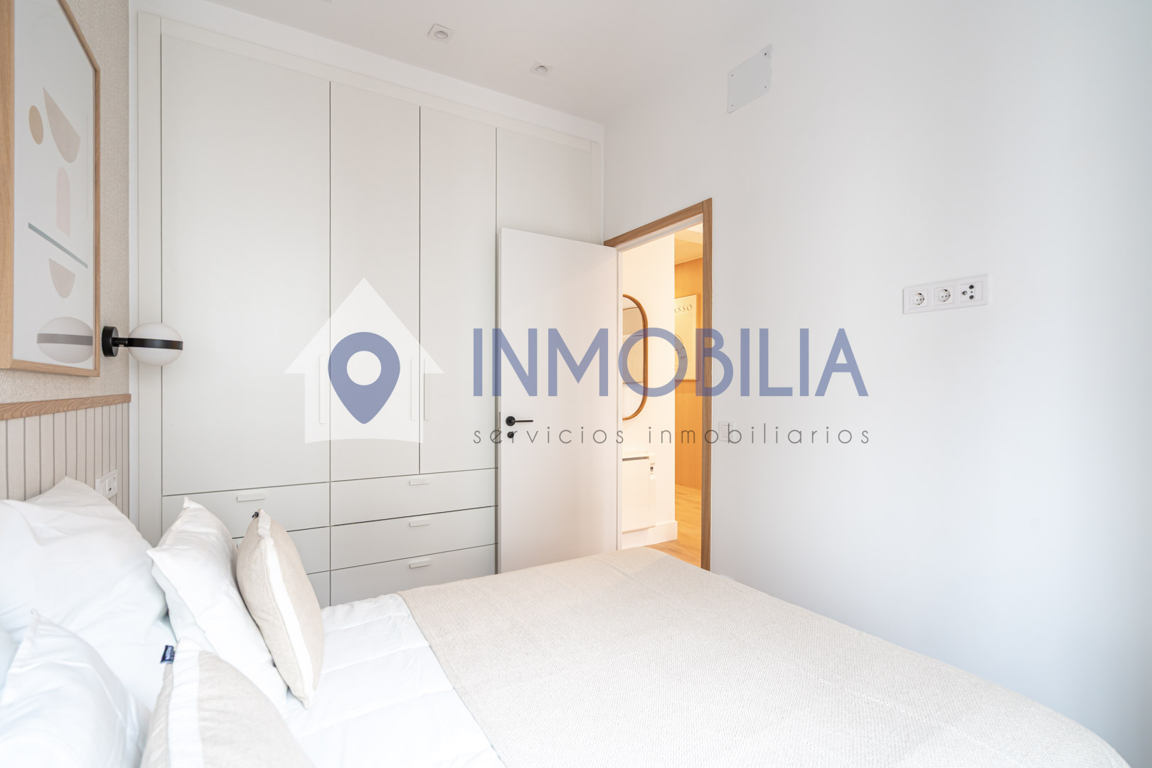 El dormitorio principal también es exterior, con armario empotrado y balcón, manteniendo esa conexión visual con el Madrid más castizo, pero con todo el confort de hoy: suelos de terrazo de alta gama, ventanas con rotura de puente térmico y una climatización cuidada para vivir bien durante todo el año.