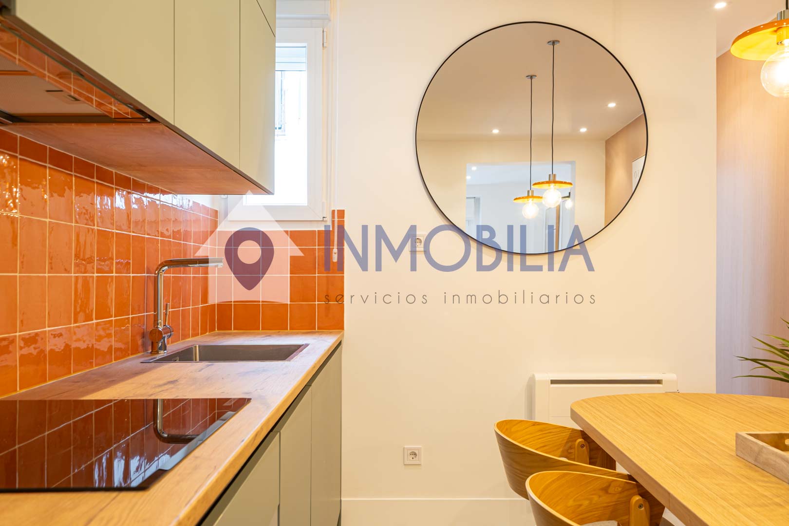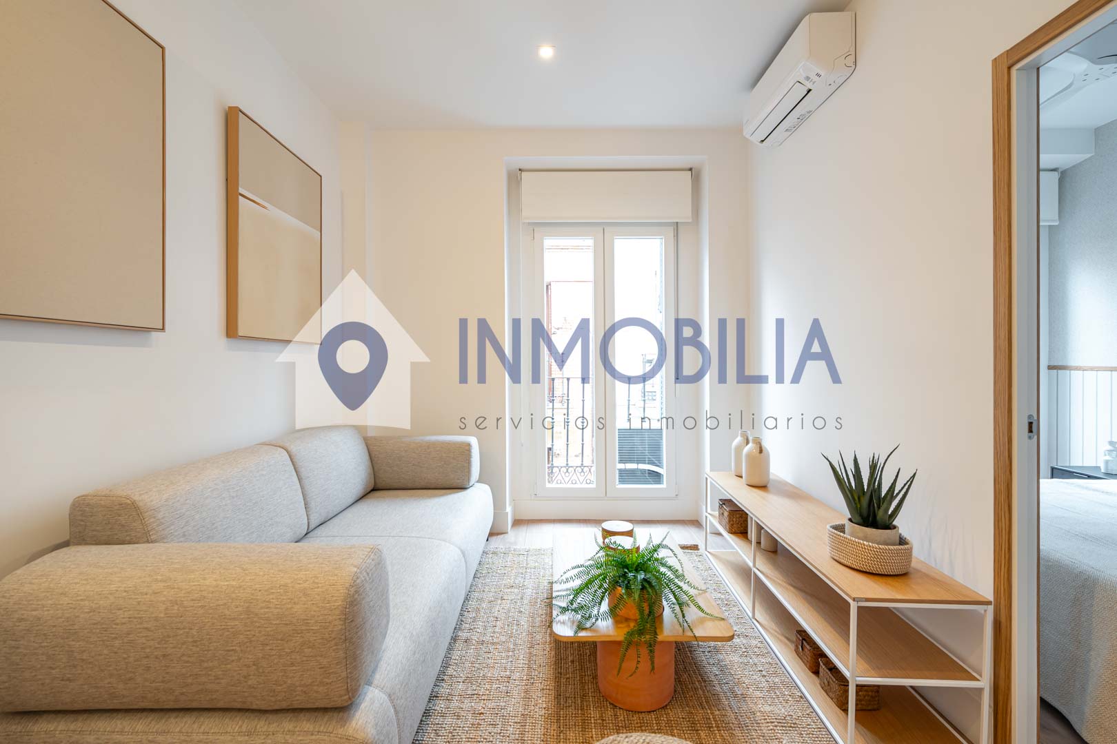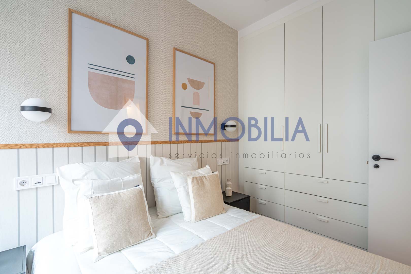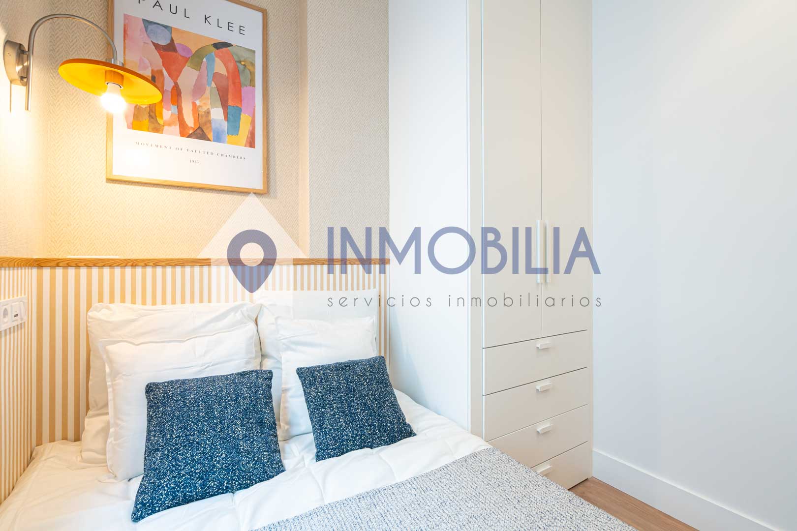 El dormitorio principal también es exterior, con armario empotrado y balcón, manteniendo esa conexión visual con el Madrid más castizo, pero con todo el confort de hoy: suelos de terrazo de alta gama, ventanas con rotura de puente térmico y una climatización cuidada para vivir bien durante todo el año.