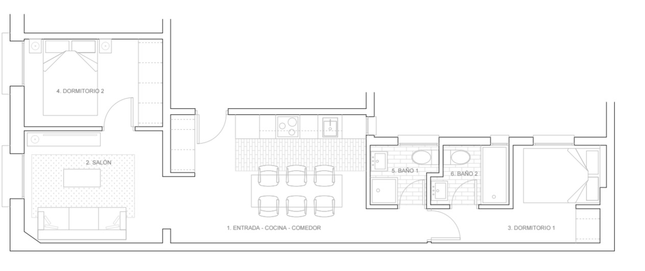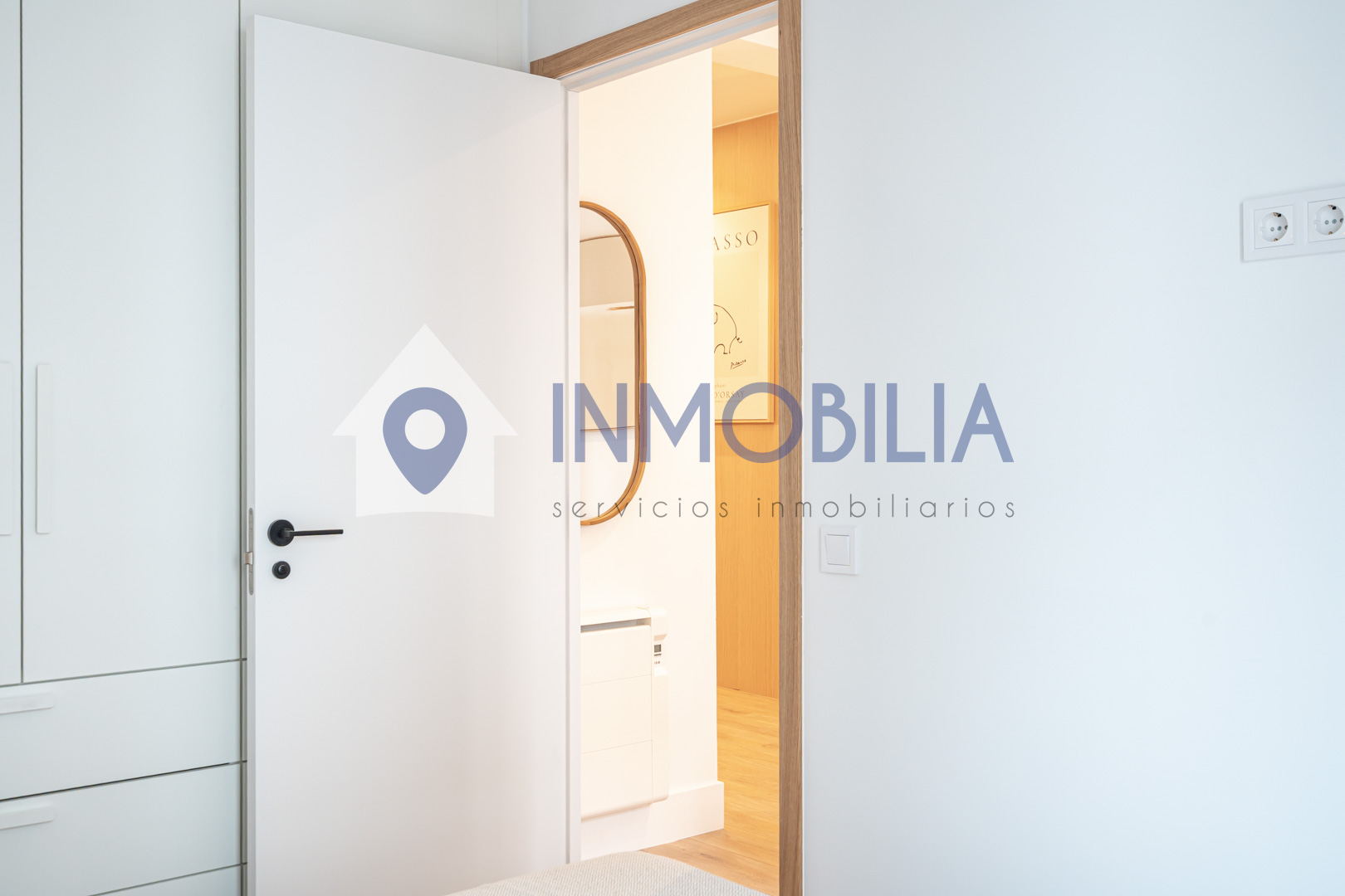 Los 70 metros cuadrados, según catastro, están repartidos con inteligencia y sin renuncias. La vivienda cuenta con dos dormitorios dobles, uno de ellos en suite, con baño privado. Ambos baños (el en suite y el general) son completos, con acabados de calidad y diseño limpio. Además, todas las estancias tienen ventana, algo cada vez más difícil de encontrar en viviendas del centro histórico.