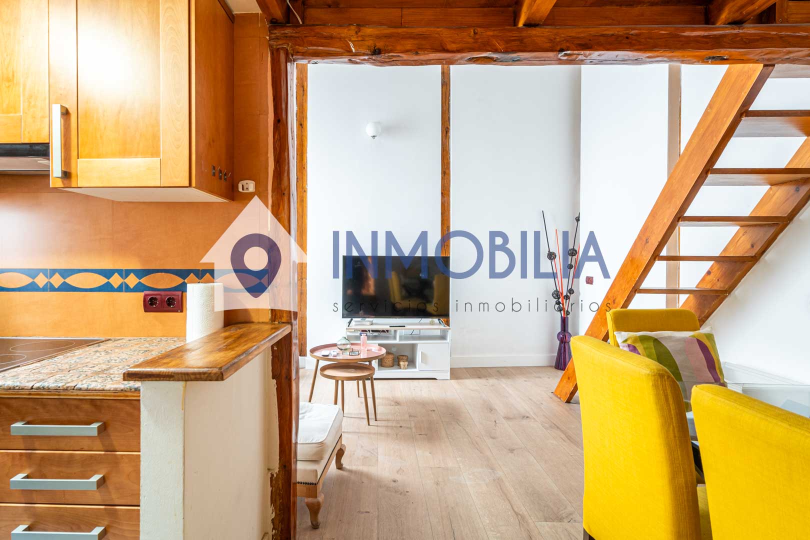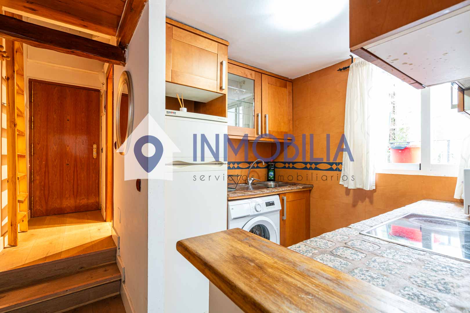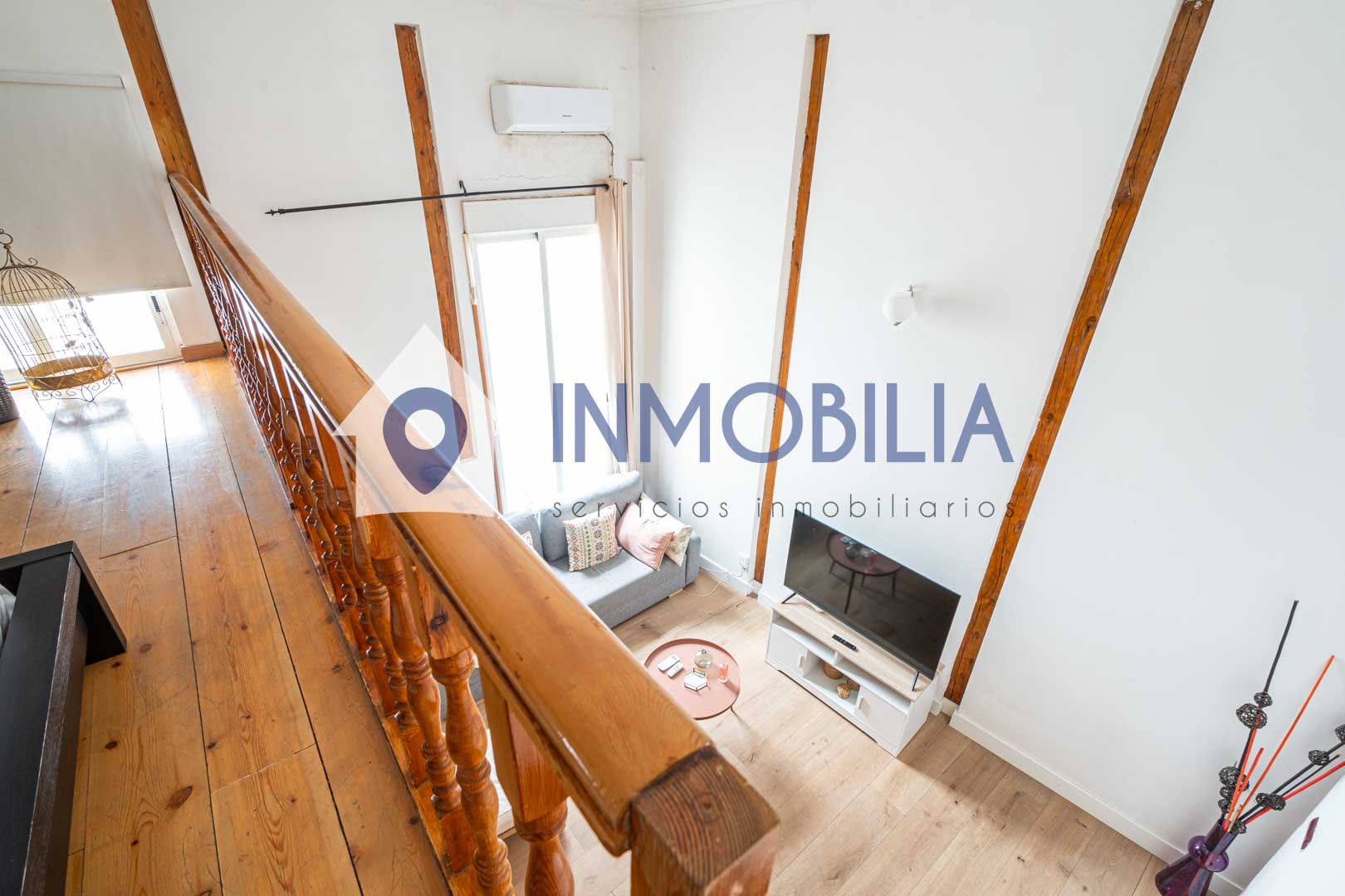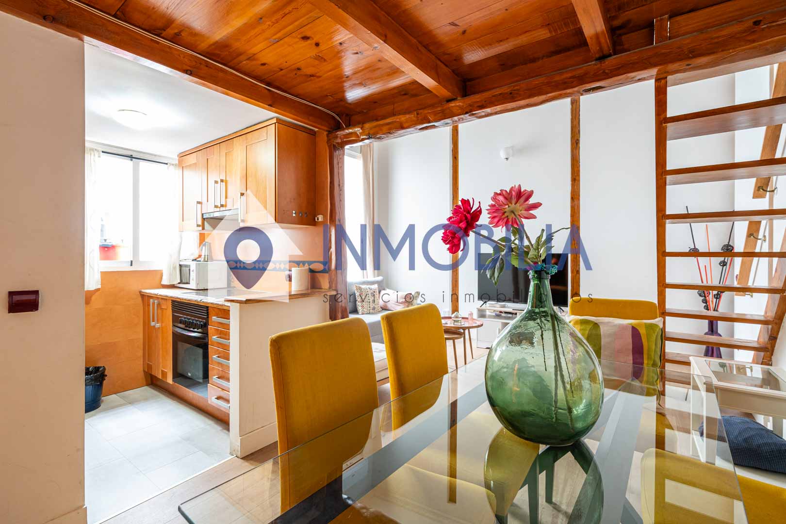 El piso, de 49 m² construidos según registro (31,59 m² de vivienda más 17,20 m² de trastero anejo en el mismo piso), es un dúplex tipo loft con una distribución funcional y mucho carácter. Nada más entrar, nos encontramos con un cuarto de baño completo con bañera, seguido de una cocina americana totalmente equipada con electrodomésticos. A continuación, se abre una elegante zona de comedor, sobre la que se sitúa el altillo-dormitorio, y finalmente, un amplio salón con más de 4 metros de altura en el techo y un gran ventanal que inunda el espacio de luz natural.