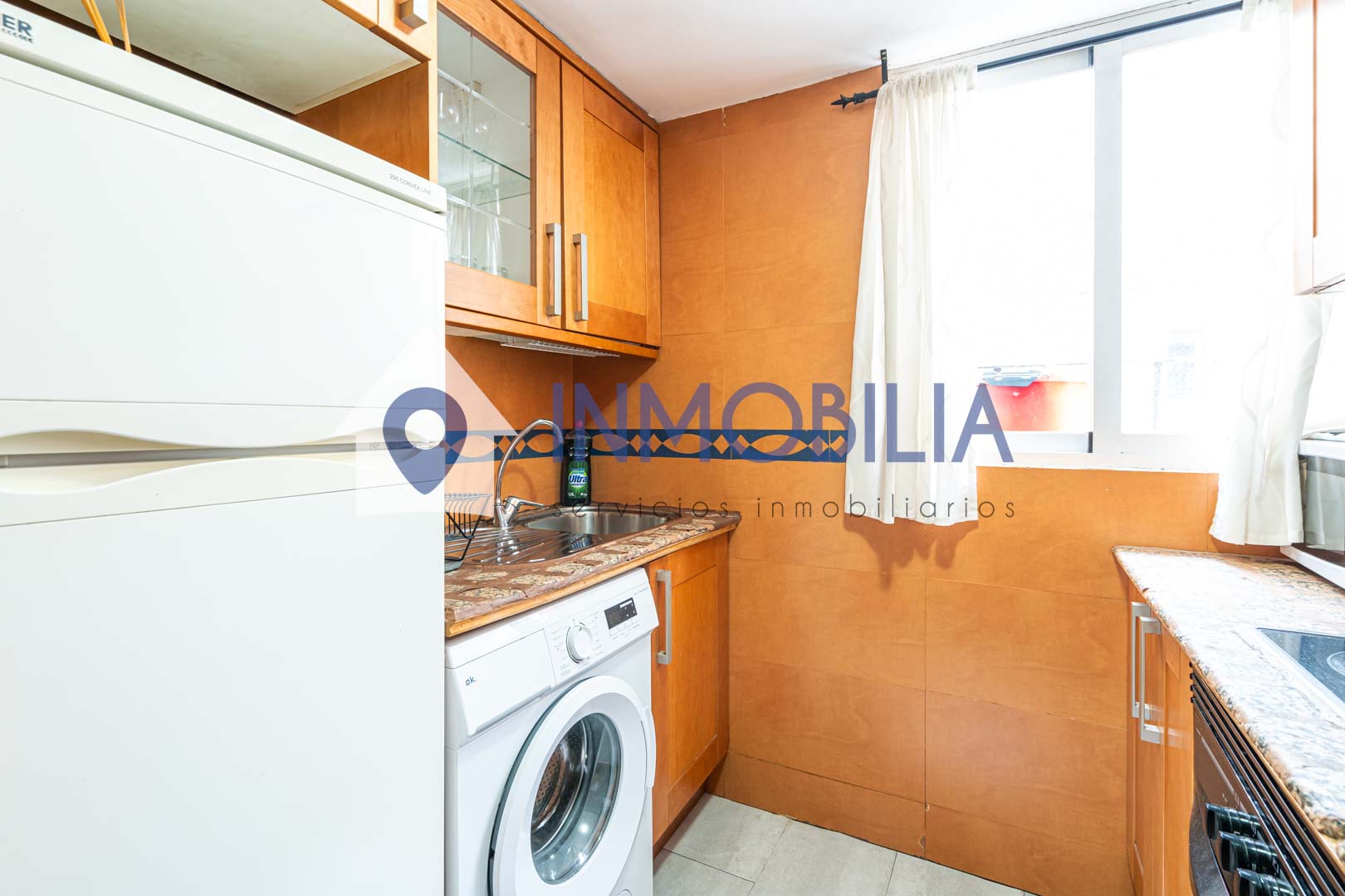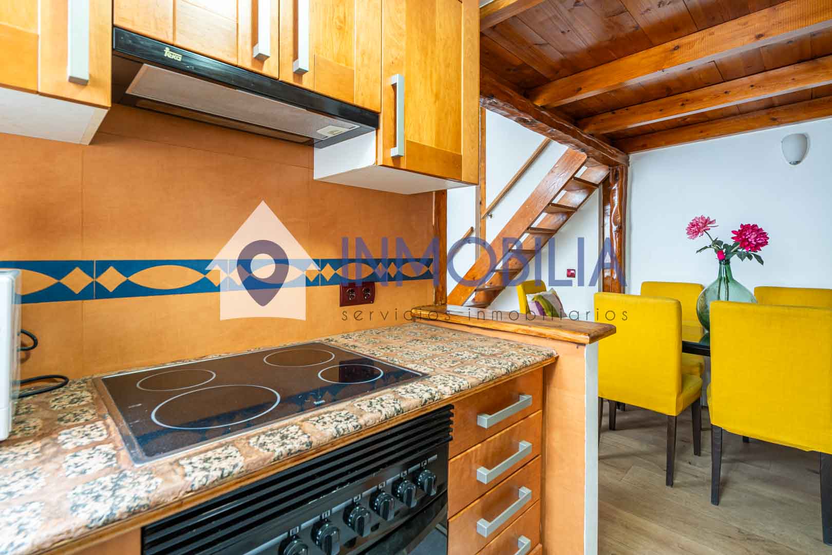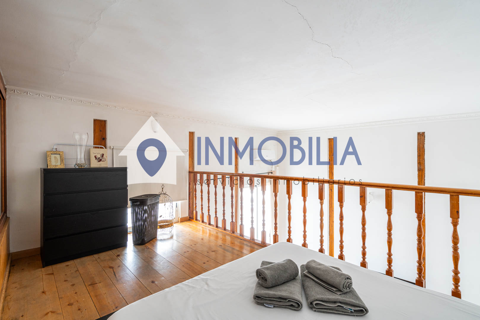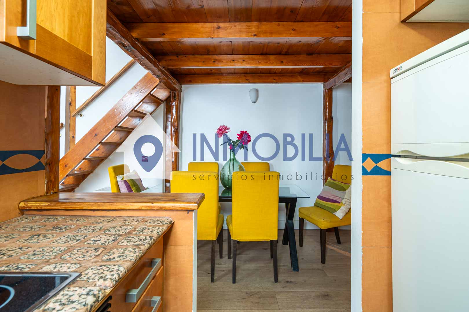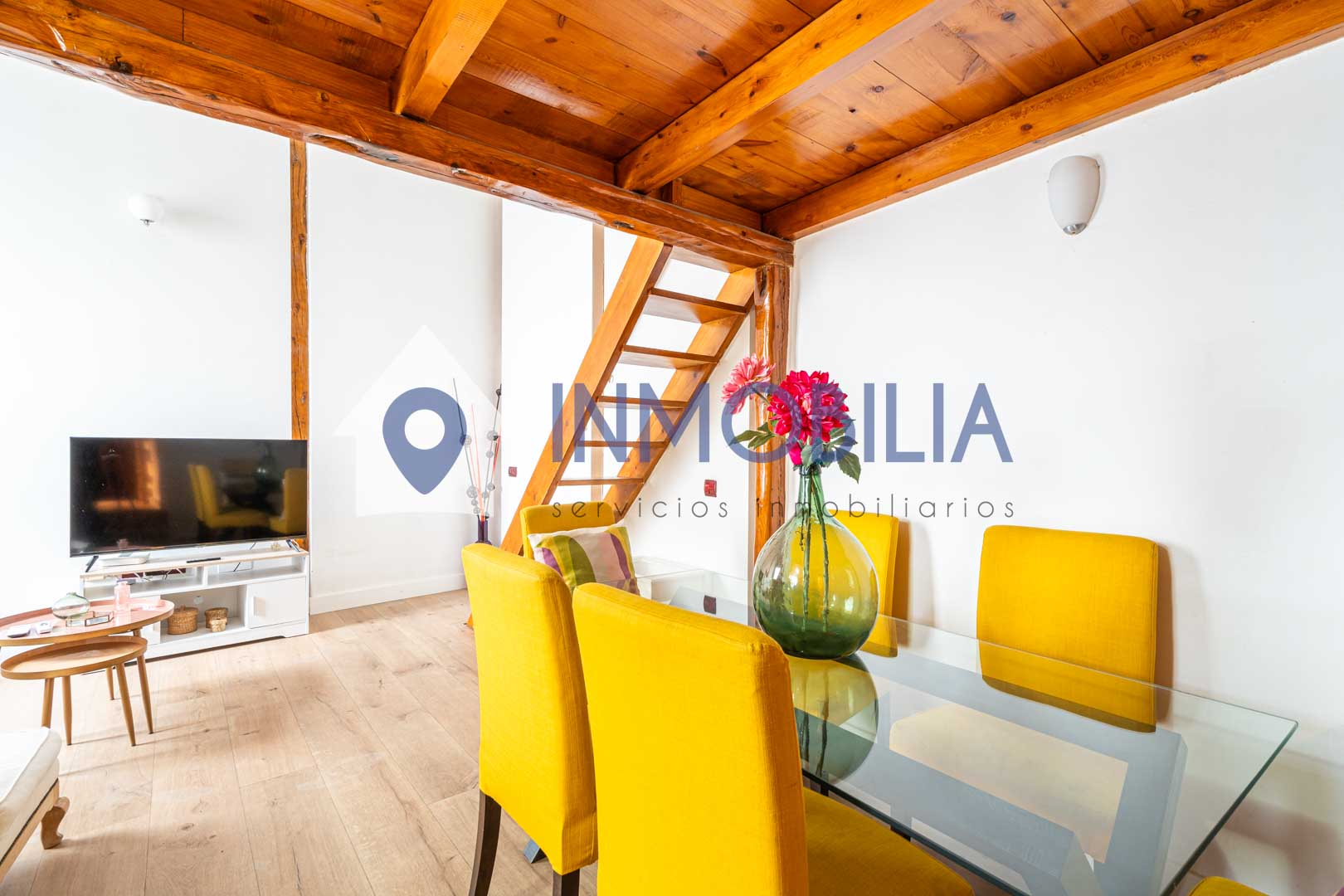 El piso, de 49 m² construidos según registro (31,59 m² de vivienda más 17,20 m² de trastero anejo en el mismo piso), es un dúplex tipo loft con una distribución funcional y mucho carácter. Nada más entrar, nos encontramos con un cuarto de baño completo con bañera, seguido de una cocina americana totalmente equipada con electrodomésticos. A continuación, se abre una elegante zona de comedor, sobre la que se sitúa el altillo-dormitorio, y finalmente, un amplio salón con más de 4 metros de altura en el techo y un gran ventanal que inunda el espacio de luz natural.