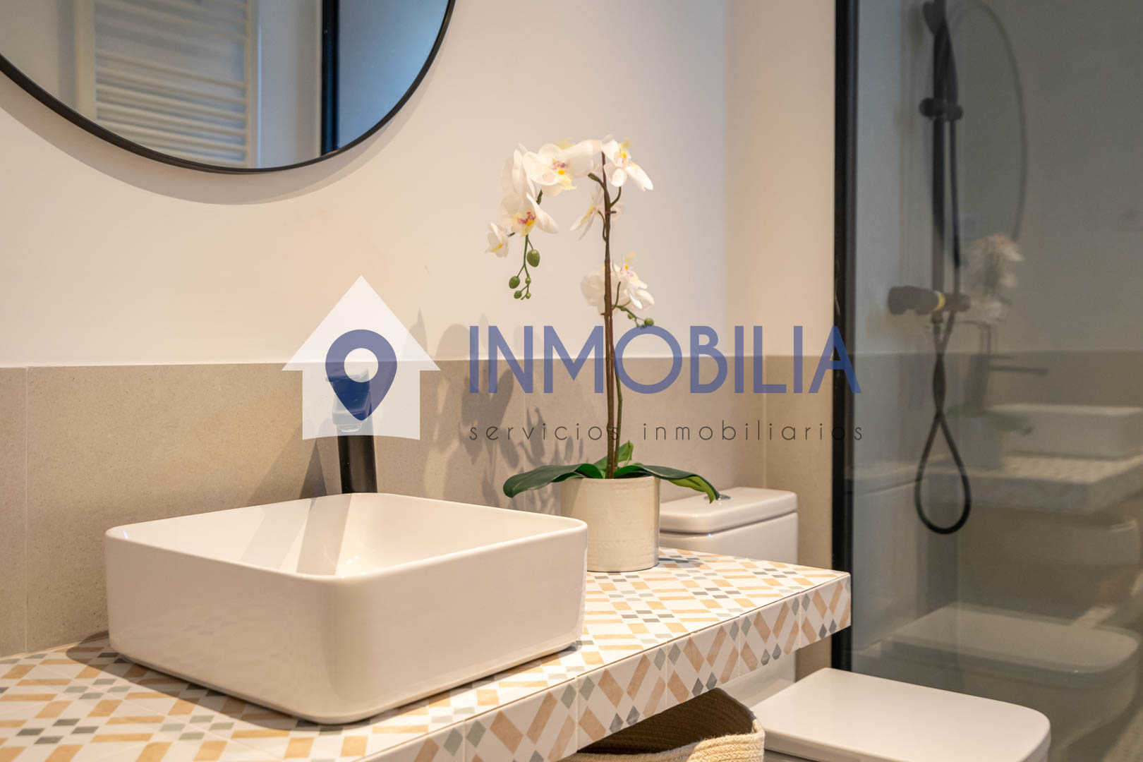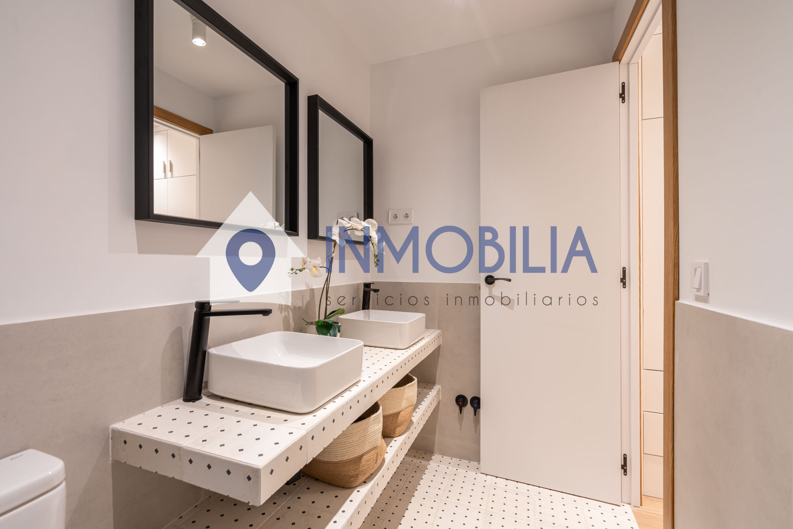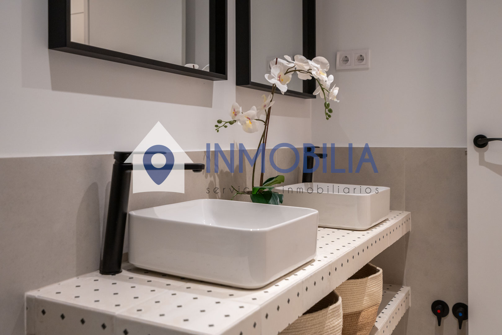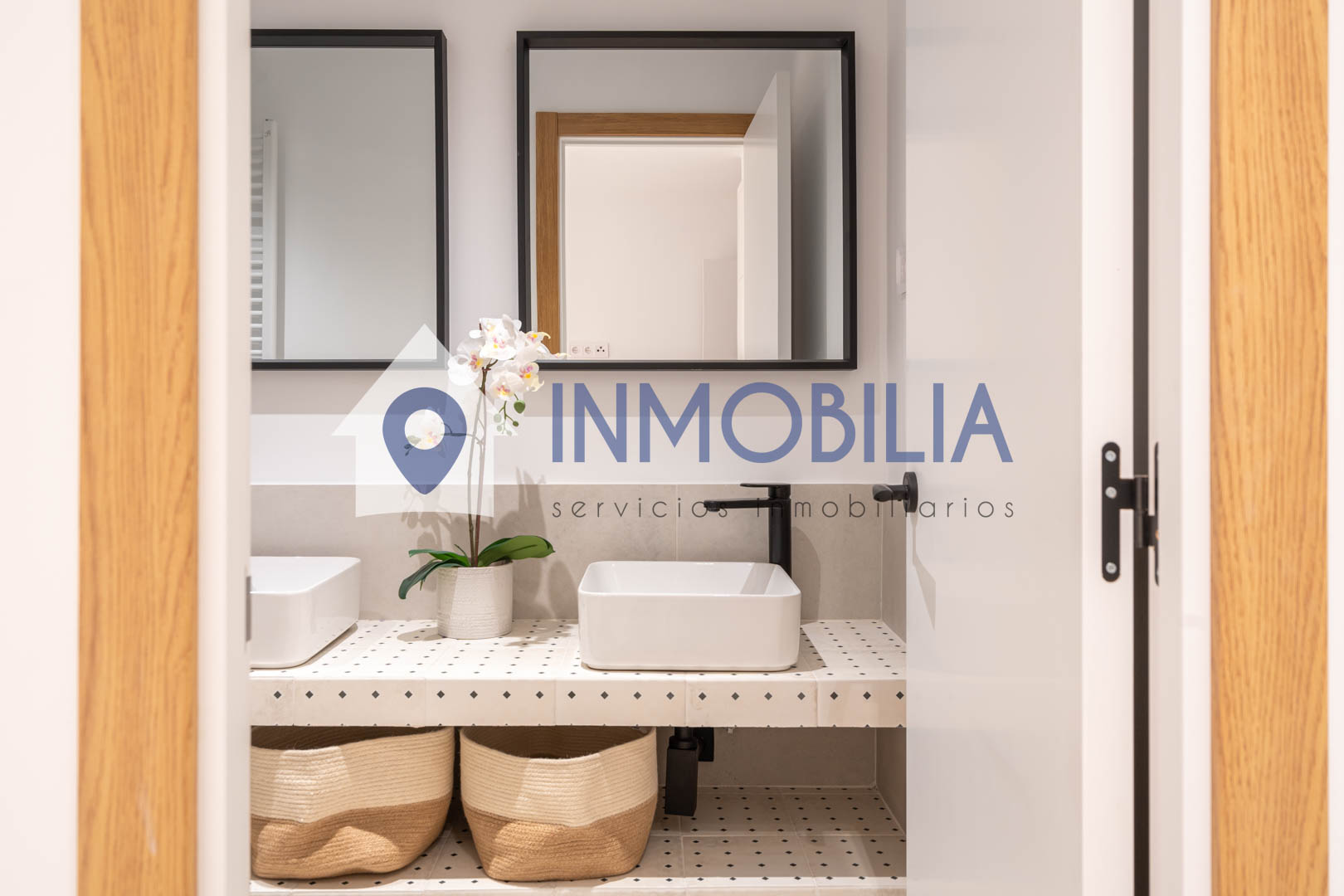Desde el primer momento, la vivienda seduce. Todas las estancias tienen ventana, lo que garantiza luz natural y ventilación cruzada en cada rincón (sí, despiertas con luz, no con penumbras). La reforma integral ha sido diseñada con ojo de interiorismo: suelos cerámicos que imitan tarima de roble —elegancia sin complicaciones de mantenimiento—; baldas de obra en los baños, hechas a medida en cerámica, combinando funcionalidad con estética; y un trasdosado completo alrededor de la vivienda para blindarla frente a humedades. Aquí no solo compras un piso bonito: compras comodidad, durabilidad y tranquilidad futura.