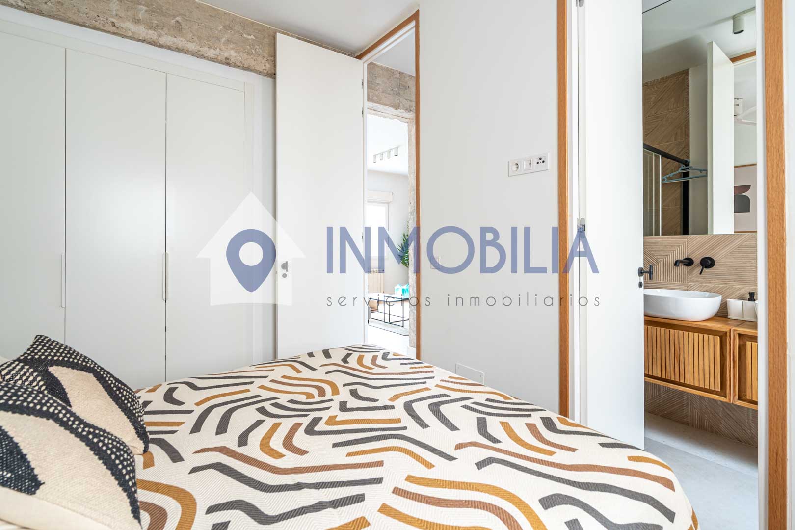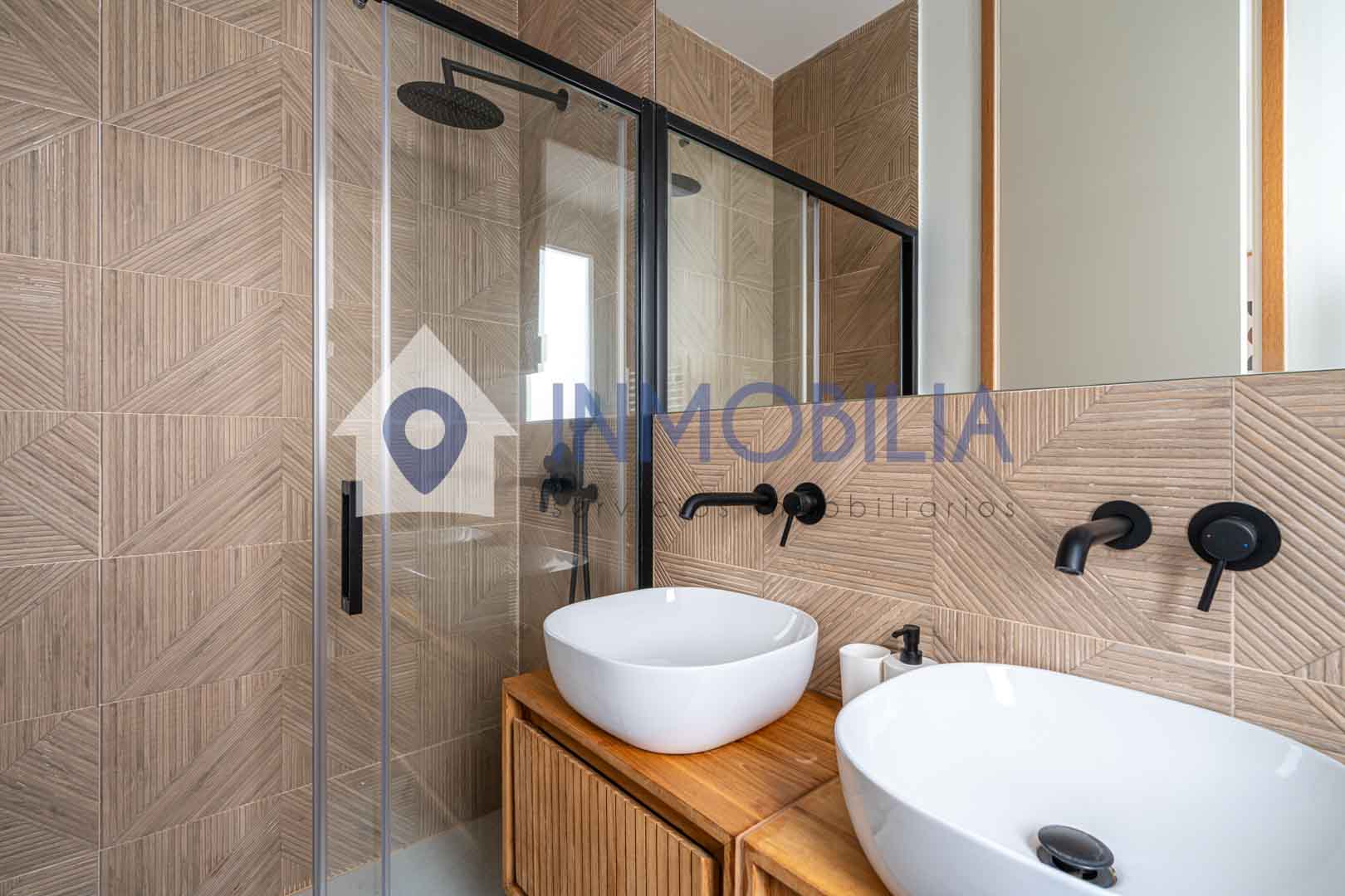 La vivienda se distribuye en tres habitaciones, dos de ellas dobles con armarios empotrados, y una principal que realmente destaca: un espacio pensado para desconectar, con baño en suite y lavabo doble. La tercera habitación, también con armario empotrado, es perfecta como despacho, dormitorio o ese espacio versátil que siempre se agradece. Además, cuenta con un segundo baño completo que da servicio al resto de la vivienda.