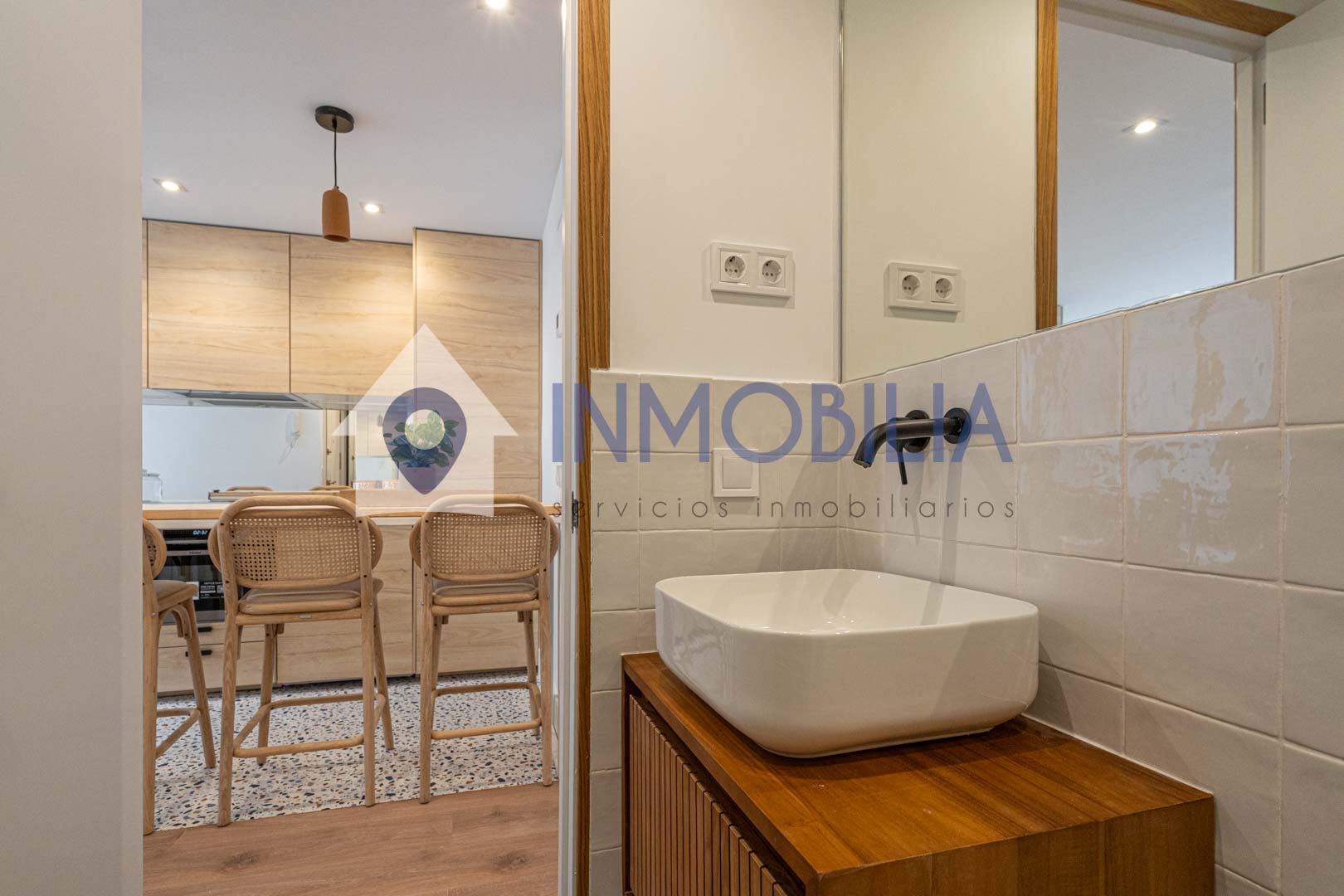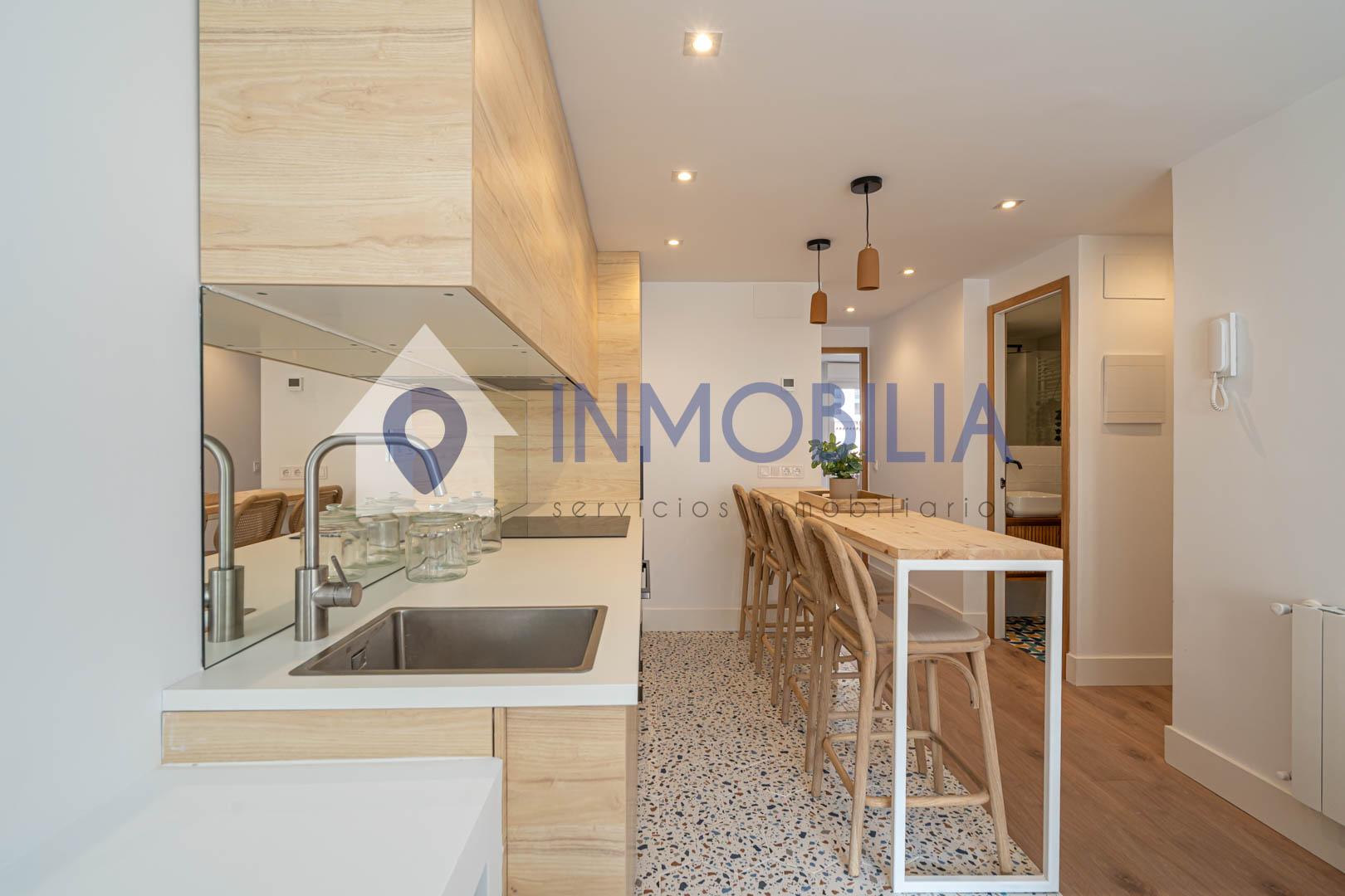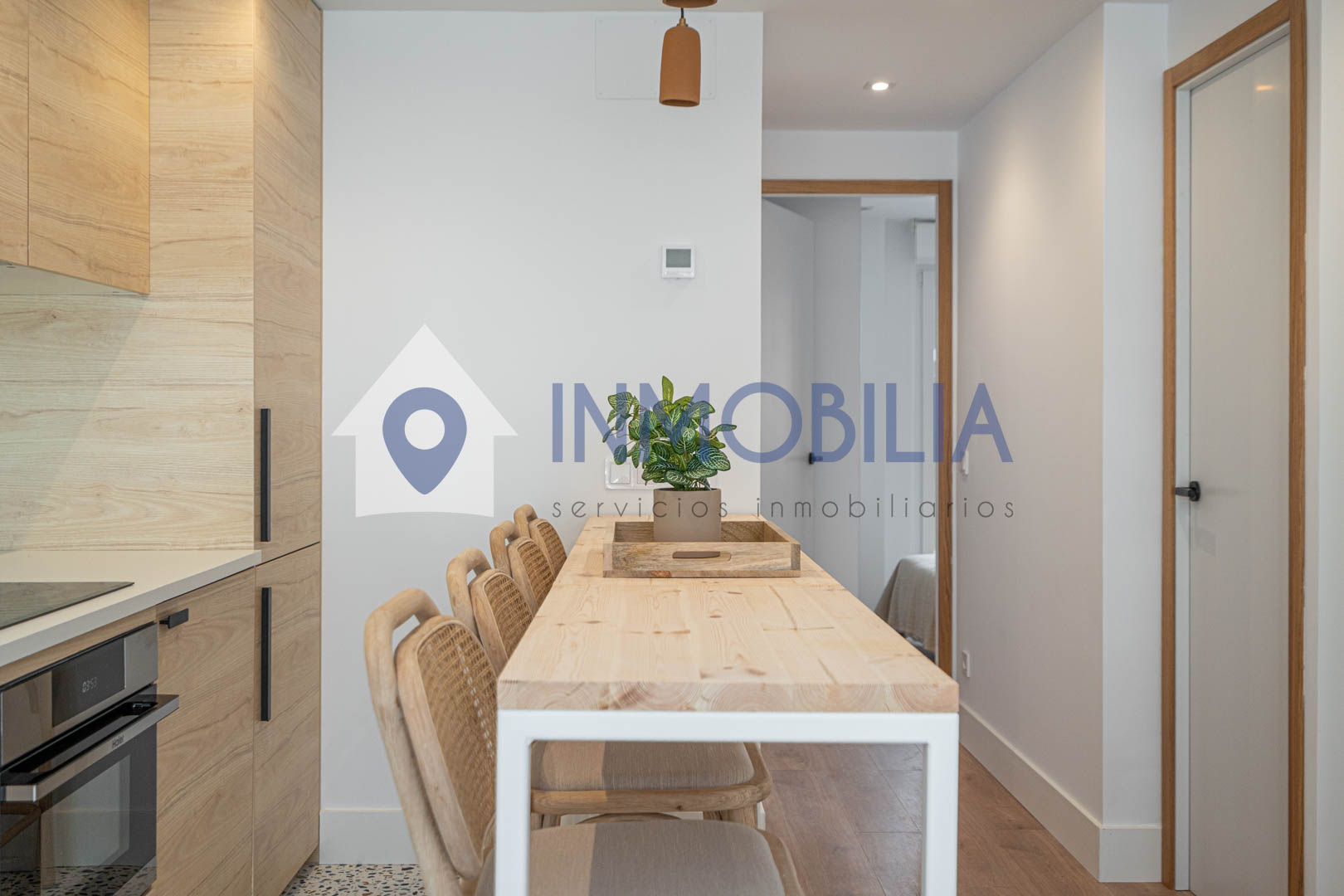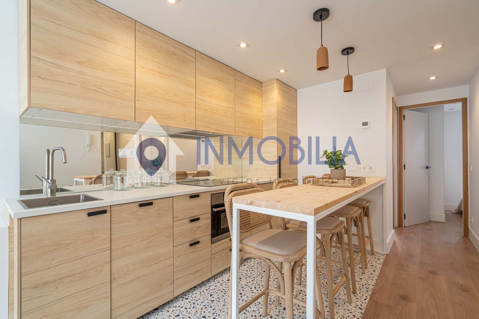 Y sí, la cocina está equipada. Pero no equipada de “bueno, algo hay”, no. Todo integrado, panelado, limpio, listo. Como el resto del piso. Hasta el punto de que no tienes que pensar ni en colchones. Ni en nada, en realidad.